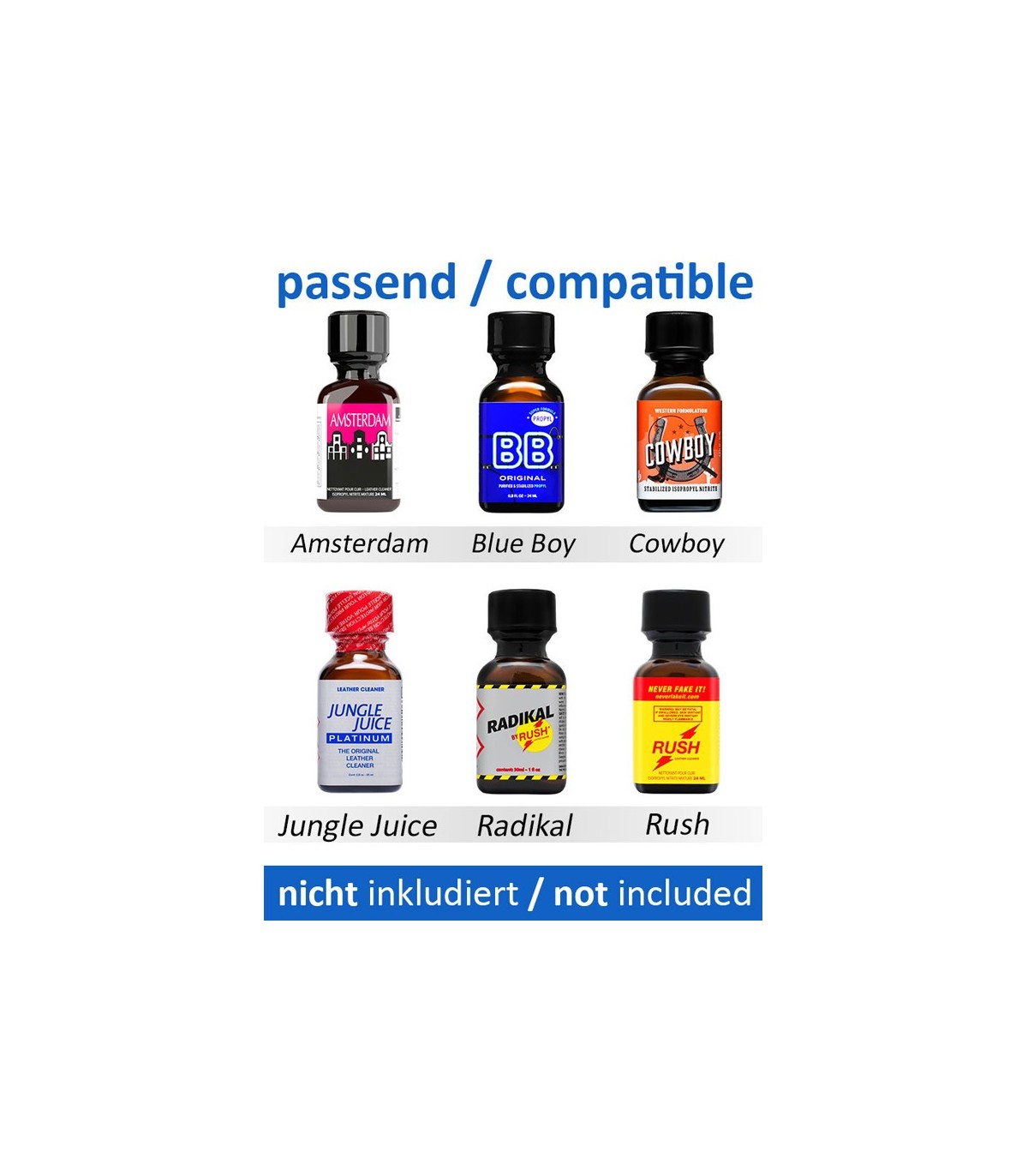 Enjoy more intense sensations with your large square bottles and this new Original Double Booster in the Large size! Just screw the booster cap on your bottle and you're ready to use your aroma more intensely and with a boosted effect! The new technology inside the Original Double Booster is highly effective: the flow from the bottle and the three air holes is controlled and mixes the aroma perfectly along the elongated neck for a devastating effect when it reaches you. This booster cap is designed to intensify the flavours of your bottles while avoiding contact with the bottle opening and its liquid for added safety. Made from high-quality brushed plastic, the rounded tips are smooth and fit perfectly under your nostrils. This version of the Original Booster Cap has a Larger thread and is compatible with all big square bottles such as Rush, Amsterdam, Jungle Juice Black Label, Radikal Rush and many others. For optimal storage, replace the original cap at the end of your session to keep it longer, the Original Booster does not prevent evaporation and leaks. Another advantage of the new Original Boosters is their outstanding quality.